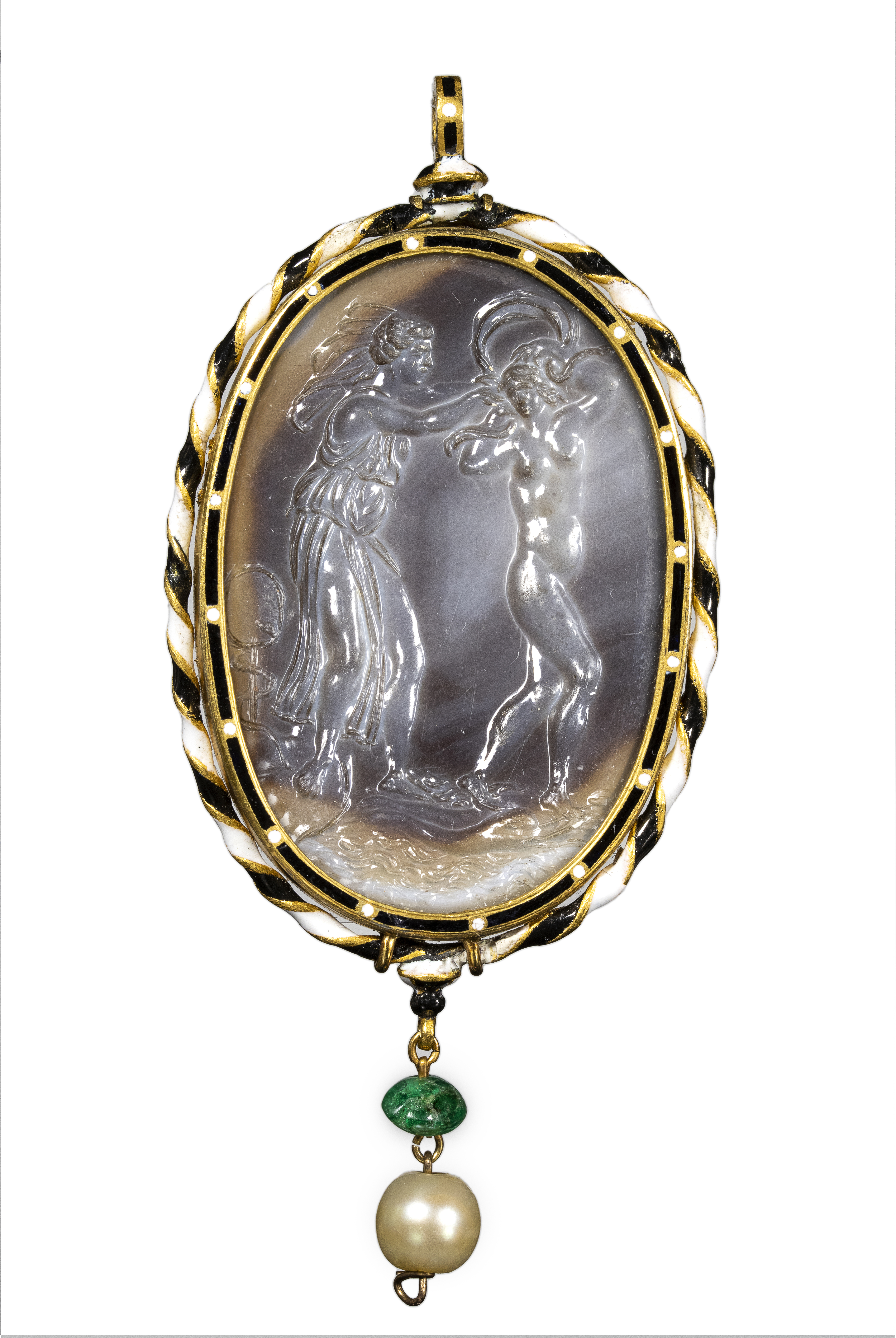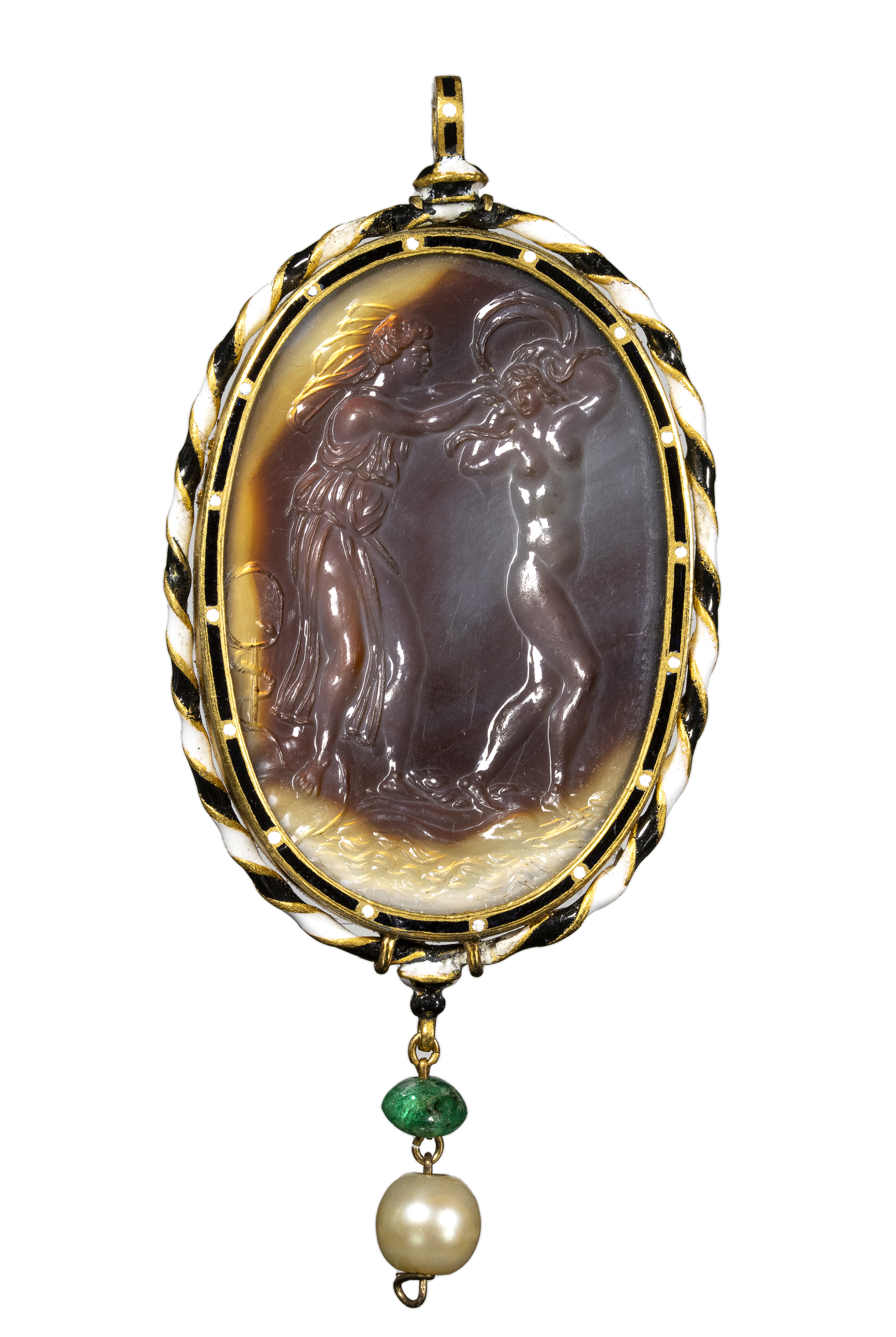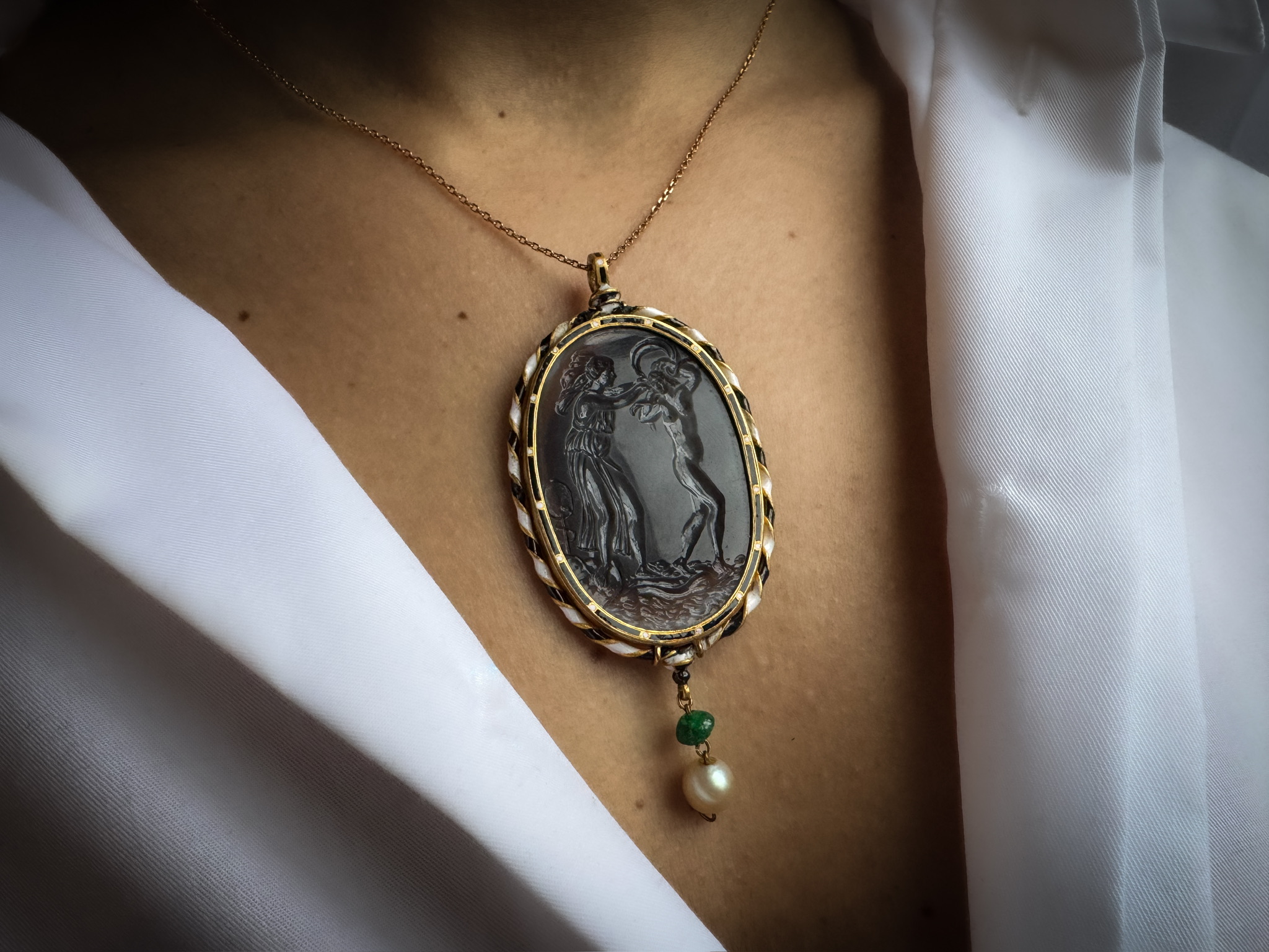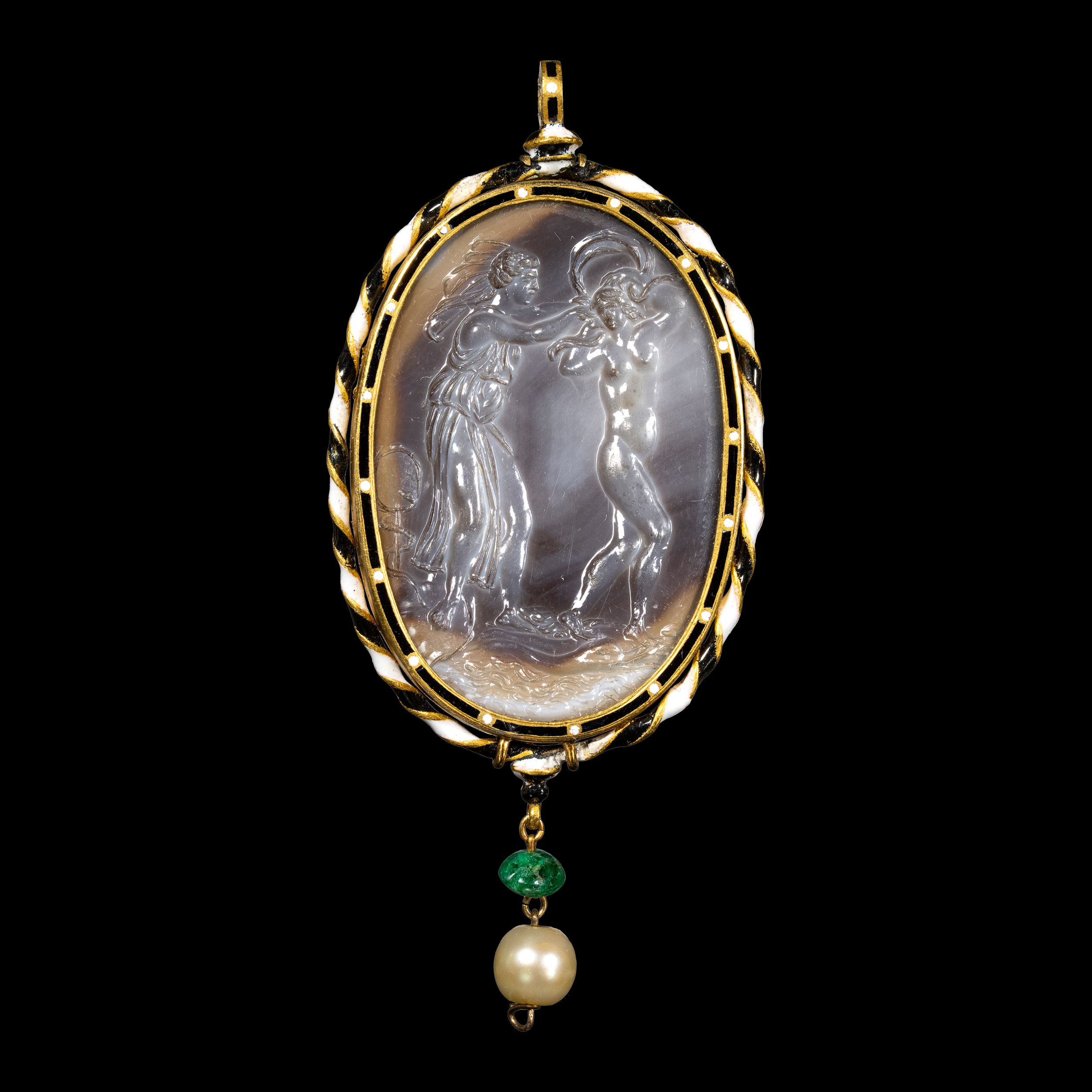Rare Renaissance gold and enamel pendant set with an agate intaglio. Allegorical scene.